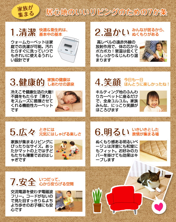 ちょっと大きめ、だけど持ち運べる軽さも魅力。日だまりの中でお昼寝したあとは、みんなが集まる団らんの場に。笑顔のたえない、家族の大切な時間と空間に、ウォームカーペットは確かな温もりを提供します。