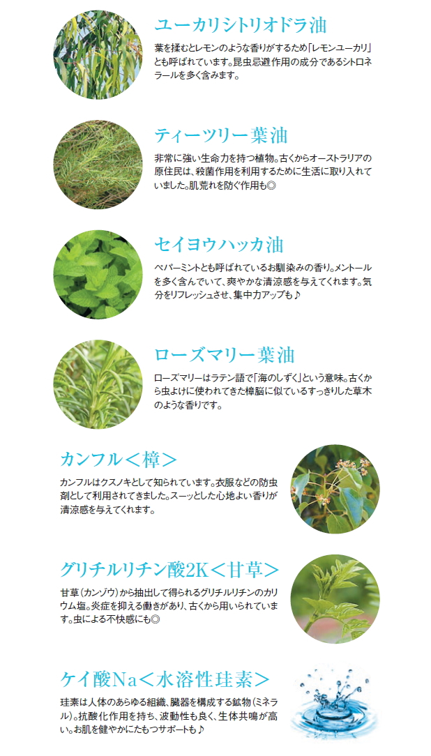 ●原材料名:水、エタノール、ケイ酸Na、グリチルリチン酸2K、ユーカリシトリオドラ油、ティーツリー葉油、 セイヨウハッカ油、ローズマリー葉油、カンフル