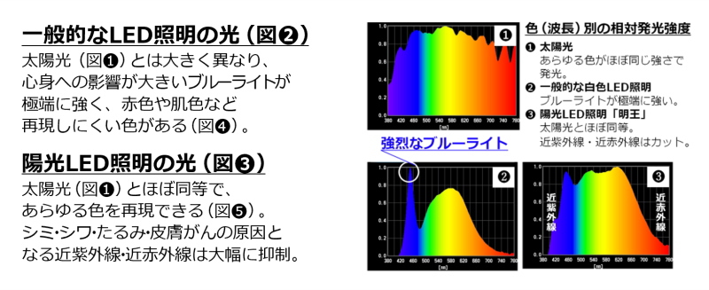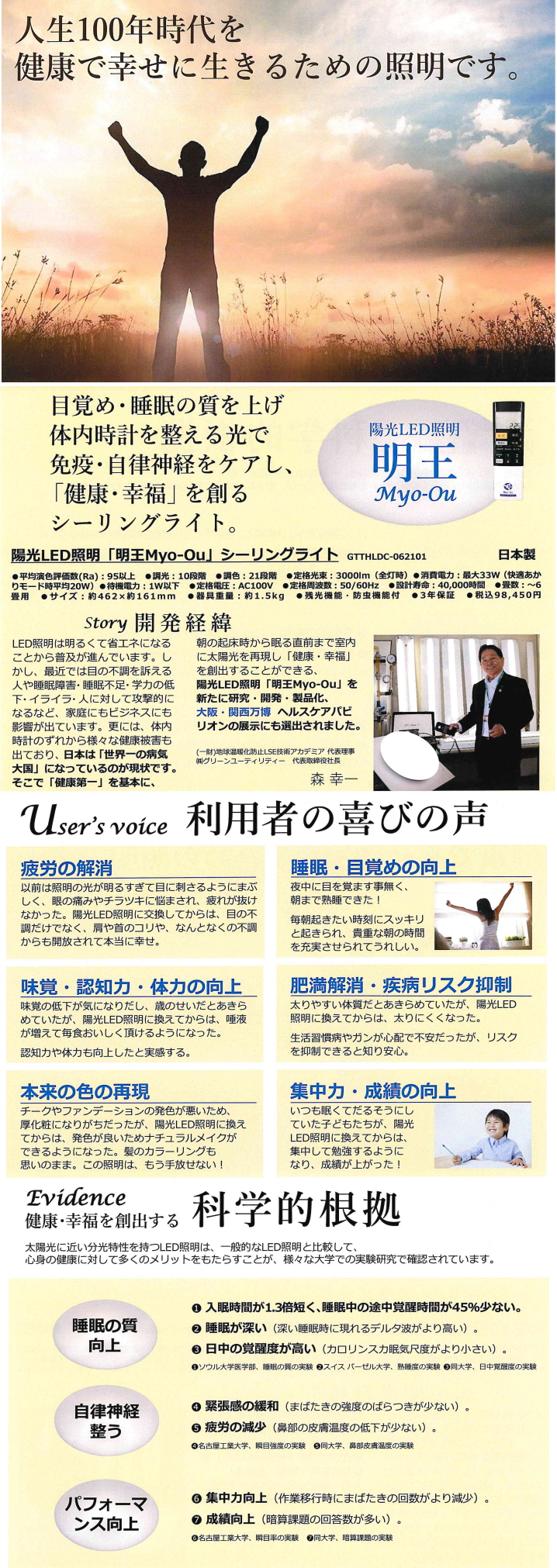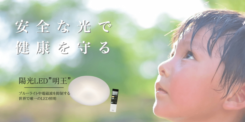 「陽光LED“明王”」は、「健康ファースト」にこだわり、国立大学との産学連携で研究・開発を行い、太陽の光の質を97%再現して健康・幸福を創造することができる、ただ「明るい」だけでなく、“人を整える光”を実現した画期的な照明です。