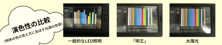 「明王」はすべての試験色の再現性が高いため、「明王」の下では文字や色がはっきりと見えます。