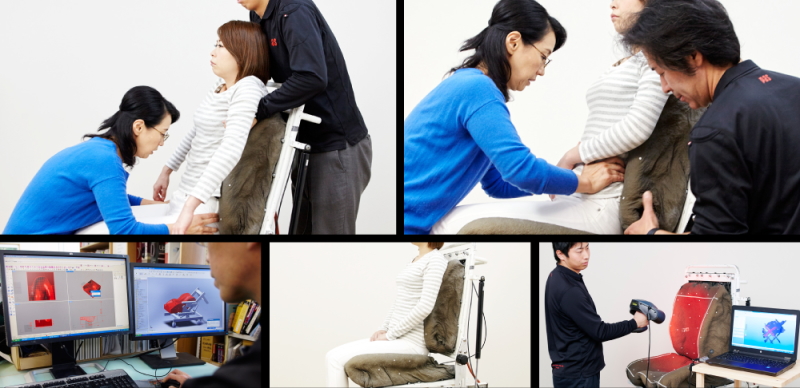ピーエーエスでは年間300件を超えるシーティングを行っています。特殊な採型機を用い、人の身体を熟知したセラピストが骨の重みを直接手で感じ、筋肉の緊張や関節の動きなどを確かめながら、解剖学・運動学にのっとった支持面を作り上げていきます。