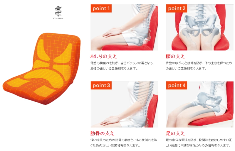 それは「エスリーム」技術によってつくられた肋骨・骨盤・足の支持面が快適な位置を見つけだす情報として座る人の身体に作用するからです。